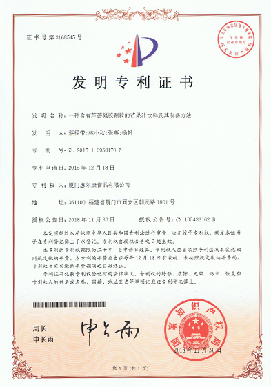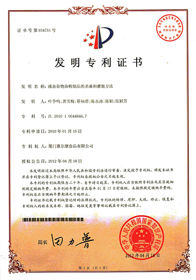 液态谷物杂粮制品的杀菌和灌装要领发明专利证书