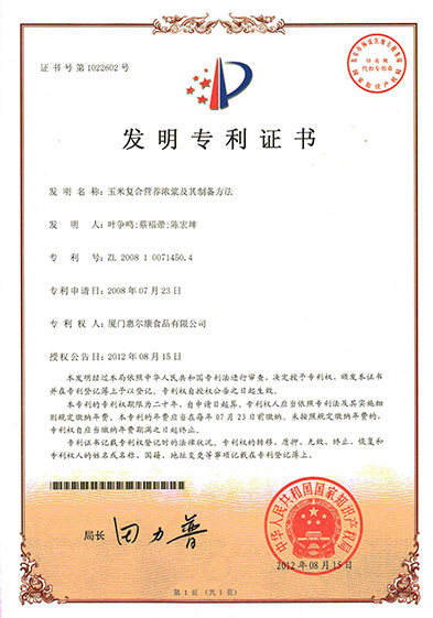玉米复合营养浓浆及其制备要领发明专利证书