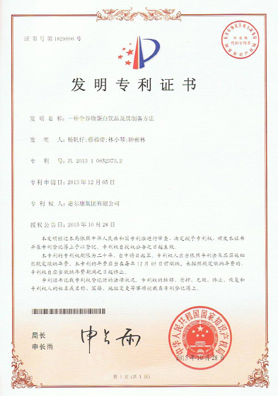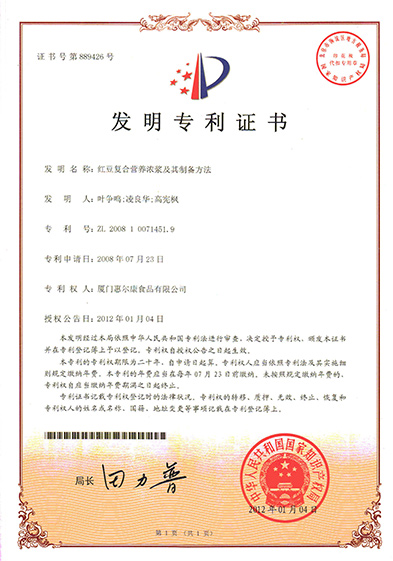 红豆复合营养浓浆及其制备要领发明专利证书