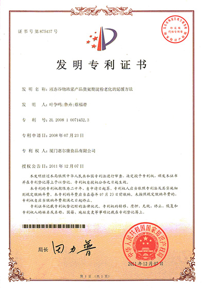 液态谷物浓浆产品货架期淀粉老化的延缓要领发明专利证书
