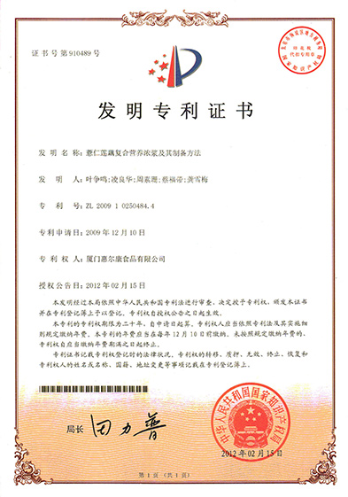 薏仁莲藕复合营养浓浆及其制备要领发明专利证书